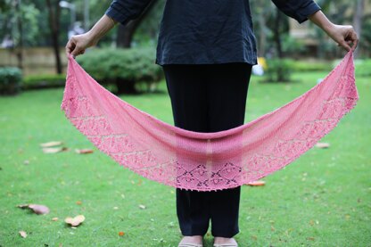 Summer Blooms is a single skein, top down, fingering weight, crescent shawl featuring the Estonian single water lily lace pattern and a beaded picot edging.