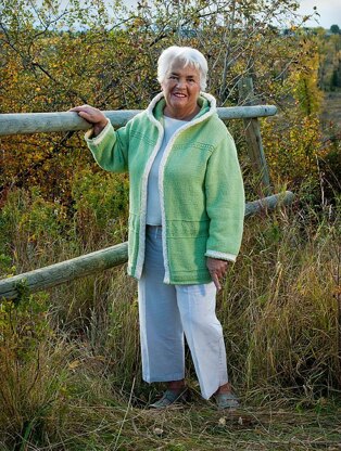 Summer breeze is a cozy cotton hoodie coat with embossed patterning detail, a contrast intarsia trim on the sleeves and a contrasting striped trim for centre fronts and hood. The Bernat handicrafter cotton (400g ball) works and wears well. The pattern could also be done in a nice 100% wool like Custom Woolen Mills 2ply mule spinner (Note: you will need to check gauge).