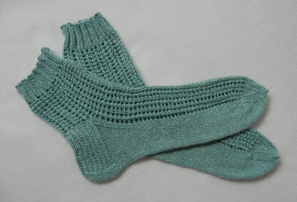 Pretty summer socks, with a breezy mesh pattern around the ankle and on top of the foot. A quick knit!