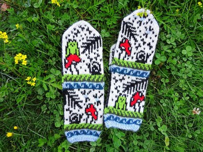 Summer by the Pond - a variation of my Summer in the Forest pattern (fingering weight) designed for thicker yarns (sport). It is also a parent mitten to the Summer by the Pond (Kids) pattern. The design features frogs and snails enjoying the warm summer by the pond.