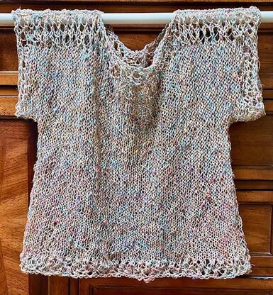 Summer Fantasy Tee Pattern Rating: Easy T shape , airy, comfortable. It is an easy to follow pattern for beginners knitters. A quick description : Front / Back are identical . Size: S/M Measurements without stretching: Top to bottom : 20”, 48 cm. Underarm measurements , flat , not around: 19”, 48 cm.