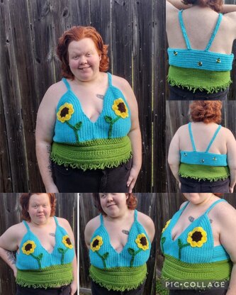 This crochet top features two main sunflowers, fringe grass, and little bees that are perfect for creating an outdoor summertime feel! I tried my best to include a very rough size chart in the pattern but my main advice is to keep comparing it to your body! I made this pattern to fit me; I usually wear a 2xl shirt. This is my very first clothing pattern I have created and I am so thrilled with how it turned out and I hope you love it as well! Don't hesitate to reach out to me if you have any questions, feedback or concerns!