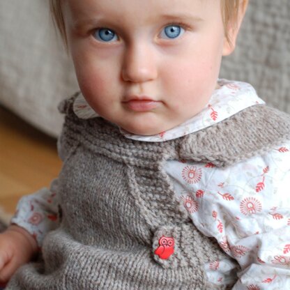 Easy-peasy cute apron-style dress that knits up in no time with an aran/worsted weight yarn. Can work for a going-back-to-school layered look, or as a sundress.