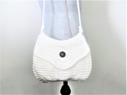 Easy to make but looks like you paid a mint for it! This bag can be made in a couple of evenings. It has a flat oblong bottom then flares out with a bit of interesting stitch work on the flap. The bag can also be made in a woolly yarn for winter and look grand! Bag can also be made longer, as well.