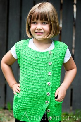 This vest is worked from the bottom up. The vest features asymmetrically placed button bands. This vest is unisex but depending on your button and color choice you can make it more girly or boyish. Instructions for optional pockets are included.