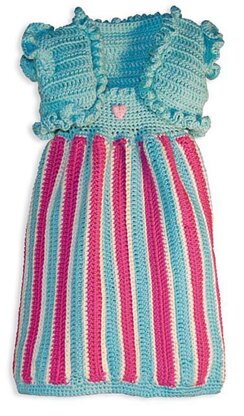 This adorable summer dress has wide shoulder straps and a matching removable shrug. The skirt is crocheted vertically, which not only adds interest, but gives an unbelievably soft drape.