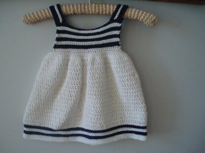 Sundress in navy and white slip stitched stripes. Straps button onto back yoke and back yoke has two button opening.