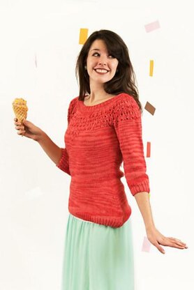 Even though the days are getting warmer, it’s still important to keep a few light sweaters like this one around for a cool night out. This knit piece has lovely geometric-shaped lace at the top and hints at a sweetheart neckline. Knit in the round from the bottom up, it works up rather quickly and switches to lace for the yoke.