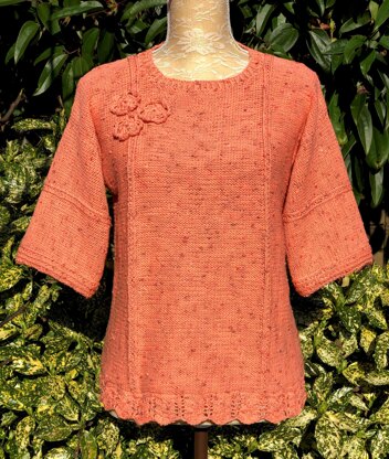A lovely top for Spring and Summer. Worked mainly in reverse stocking stitch with 2 flattering, vertical 3 stitch raised ridges on the back, front and reflected on the sleeves. Completed with a pretty lacy lower border and 3 crochet flowers. The body is worked bottom up and the sleeves sideways. Full written instructions given.