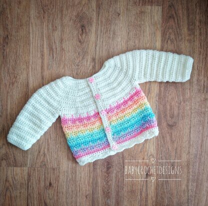 This cute cardigan can be made in so many different colourways and is great for using up part balls to make a unique cardigan. It is made from the top down with a round yoke using a hdc stitch.