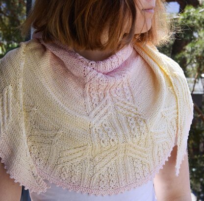 The shawl features a lace and cable pattern in the center and along the border finished by a picot-bind off. The elegant crescent shape is created by increases along the central panel in every other row and at the beginning and end of each row.