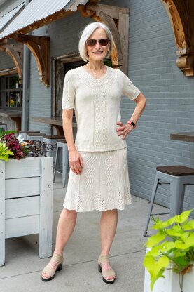 Cool, summery skirts knit in plant-based fibers are a traveler’s dream—light and packable, wrinkles diappear quickly, and they wash/dry in a snap. Not to mention versatility; a cool skirt goes from breakfast to beach to dinner and theater, combining with tops and accessories to suit any event. This shimmery beauty in ten sizes (XS to L and 1X to 6X) is no exception; with top-down construction, elastic waist, and a fun-to-knit stitch pattern, it’s easy to knit and wear. We love it so much we’re knitting one in wool for fall and winter! Designed to be paired with the Summershine Top as a 2-piece dress option.