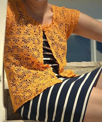 This dressy yet light summer top is made of square crochet motifs. The fitted back and intentionally over-sized fronts create an edgy look, while allowing for a cozy and comfortable fit.
