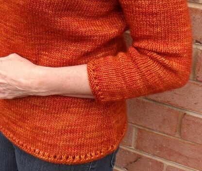 This DK weight pullover is basic, easy, very wearable and has the simplest of touches - a bit of stretchy garter at the shoulders to conform to your shape, a simple garter-edged scoop neck, 3/4 sleeves, gentle waist shaping , and an easy eyelet edging.
