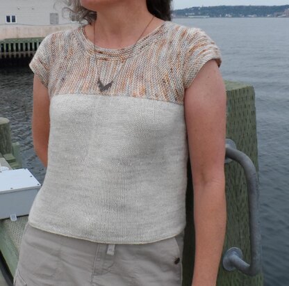 A breezy, slightly cropped tee knit in fingering weight yarn. The sleeve caps and bodice are knit side to side in garter stitch. The body is then picked up and knit in stockinette. Front decreases under the bust keep it from being too roomy in front and a longer curved back gives you a bit more coverage where you need it. The body is finished off with a double-knit hem.