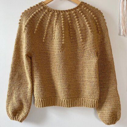 The Sunbeam Sweater pattern is designed with 'beams' of bobbles radiating from the neck and is worked from the top down. It is made with dk/light weight/8 ply yarn, but works well with Aran/medium weight/10ply yarn and 5mm hook (*size down for this option). Gauge height is less important here as you can very easily work to the given measurements instead of row counts. Length is also adjustable to suit your style.