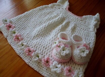 This little dress is worked in the round with frilled shoulders and a row of little flowers worked in the row all around the hemline. The shoes are trimmed with the same flowers with an ankle strap to keep them on little feet.