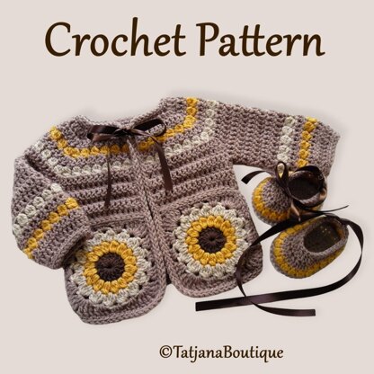 Crochet Pattern "SUNFLOWER" Baby Cardigan and Booties set decorated with satin ribbon. ♥♥♥ Size in this pattern 0 - 3 MONTHS. The pattern is written in US crochet terms but with a conversions at the beginning of the pattern to UK / Australian terms. Its just that some of the names of the stitches are different. Materials & tools you will need: ★ Acrylic or other yarn 150 gr approx. - DK, Double Knitting in UK, Light Worsted in the USA, 8ply in Australia. ★ Crochet hooks sizes recommended 4 mm and 4.5 mm. ★ 1.5 m satin ribbon. ★ Yarn needle to weave in ends. (optional)
