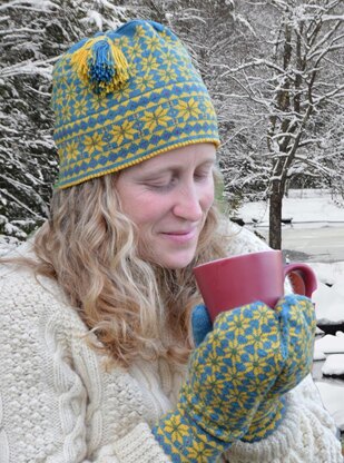I love to design with motifs from long ago and to knit in a high gauge for lots of detail. This mitten (3 sizes) and hat (2 sizes) set was inspired by a sweater from Sunnhordaland, Norway, knitted in the 19th century. I first saw this sweater in the book Nordic Knitting by Susanne Pagoldh, Interweave Press, 1991. I love the two types of stars, which the Norwegians call "eight-petaled roses". Although I chose Swedish colors for this pair of mittens, I think the design would look lovely in any number of color combinations. I added a facing for the cuffs and the brim of the hat to increase warmth and longevity. This is created with a provisional cast-on and a picot turning-edge for a crisp beginning to all the pieces. The gauge is high and requires a lot of patience, but you will be rewarded with an heirloom quality hat and mittens set.