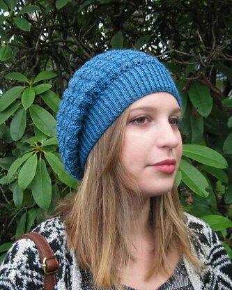 This beret is designed to be knit in two colours to accentuate the textural rib stitch stitch pattern. The pattern instructions for the two-colour version is provided. As shown in the cover samples, this beret can be knit in one colour, or even in a self-striping yarn.