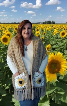 Pocket shawls seem to be all the rage right now. Since I grew up in Kansas, the Sunflower State, I decided to incorporate sunflowers in this pattern. Kansas is also known for its fields of grain, thus the tan background. The fringe reminds me of wheat stalks blowing in the wind.