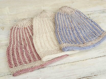 The Sunny Rays Beanie is a super cute, well fitting and warm Retro Look hat pattern and comes in five Sizes: 0-6 months, 6-12 months, 1-2 years, 2-3 years, 3-4 years To fit head circumferences of approx. 40- 43- 46- 48- 51 cm or 16- 17- 18- 19- 20 " Materials: DK Weight Yarn, 50 g (175m) in Main Colour (natural) and 50 g (175m) in Contrast Colour (blue, pink or white) Yarn Suggestion: Rowan Felted Tweed DK Knitting Needles: 4.5 mm or US7 , short circular (40 cm or 16 “) or DPN's for seamless hat Tension/ Gauge: 20 sts and 40 rows make 10 cm or 4 " square The hat is worked flat, from side to side and comes in two versions, seamed and seamless.