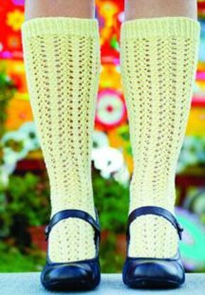 This toe-up, patterned sock features a four-stitch twisted rib and simple lace to create a wonderfully stretchy fabric that will skim pleasingly over your leg curves yet requires less shaping than a stockinette knee sock.