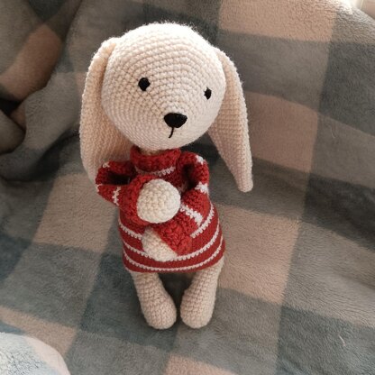 This is a crochet pattern of a bunny in a striped sweater. The sweater is part of the bunny's body, you do not need to crochet it separately.