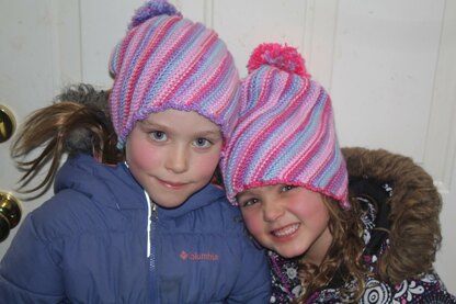 Knit sideways this hat is knit in an 8 row pattern that is all K and P with only one addition, Kfb increases and K2tog on the ends of the rows to form an odd-shaped piece of knitting that when sewn together makes a beautiful swirled hat for young and old. Instructions are easy to follow and making one toque takes a mere hours. Make from any weight of yarn and in any size by just adjusting the height by adding or subtracting the number of cast on stitches. Vary the width of the hat to fit any head circumference by adjusting the number of repeats of the pattern you work. Easy and just darling when topped by a Huge pompom.