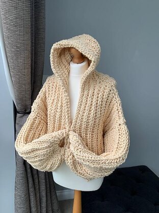 This oversize cardigan is knitted using super chunky yarn and Fishermans Rib to create a snuggly, squishy texture. The body is worked flat as one piece and then divided at the armholes and then again for the hood. The balloon sleeves are worked in the round.