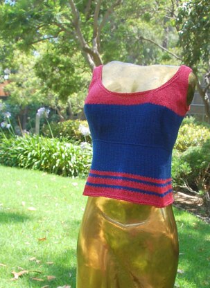 This is a pattern for tank top worked from the under-bust to the straps and then, rejoining yarn, worked from the under-bust to the bottom edge. A slight A-line to the body is created by increasing needles size. The bust and body are worked in the round and may be easily adjusted for a personal fit. The straps are worked (flat) and joined (at top of shoulder) with a Kitchener’s Stitch graft. The changes between stripes include one round of a knit/slip st patterning. Once the main body and straps are complete, sts are picked up for the neckline and armhole edges. A simple Garter St edge is worked before binding off.