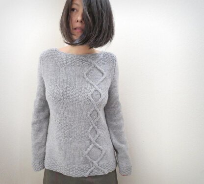 An easy wearing pullover with asymmetrical cable placement with textured horizontal bands for style.