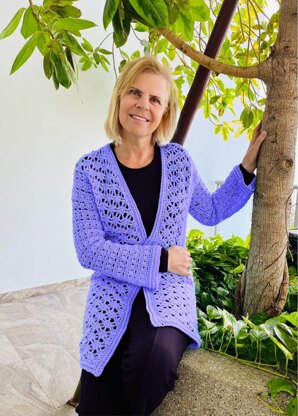 Isn't this an interesting looking cardigan? The bottom of the back panel and the sides of the front panels are done in a star looking stitch ( simply made up by chain stitches, single crochets and double crochets. The 5 rows that make up this pattern is explained with a diagram and step by step pictures and is fun and easy to do! The rest of the cardigan is done in a playful combination of SC and DC. The cardigan is very easy to make custom fit, the bottom determines the width, the rest of the back panel determine the length. All you need is your favorite weight #4 yarn, or anything suitable for hook 5mm / H, in your favorite color, a hook 5 mm/H and this easy to follow pattern! This pattern is for adventurous beginners and all level crocheters.