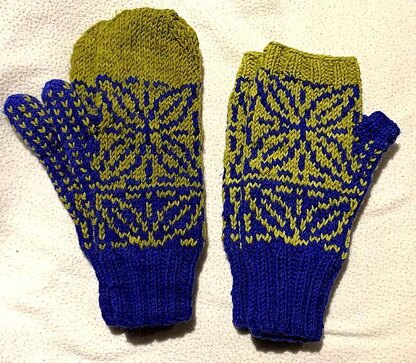 These mittens were inspired by the patterns on some silver bowls found at the Sutton Hoo Ship Burial site in England. There's also a matching cowl pattern.