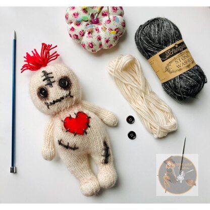 45g – Cream (moon stone) Scheepjes Stonewashed XL Small amount of red yarn and crochet hook for the hair Small amount of black yarn for embroidery sts Red felt – voodoo doll heart 4mm knitting needles (worked flat) tapestry needle, stuffing 2 x 1.5cm buttons – If you prefer not to use buttons you can embroider the eyes with black yarn and a tapestry needle Small amount of black or white thread and sewing needle for buttons OPTIONAL: Black and brown blush for details