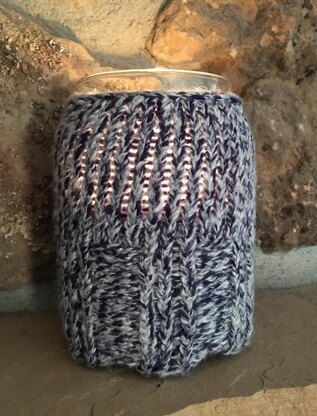 The Sweater Candle Jar Cozy is loom knit on the All N One loom with approximately 150 yards of a worsted weight yarn. Bernat Denimstyle in the Indigo colorway was used in the sample.