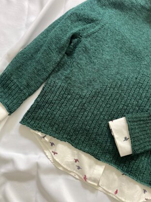 GARMENT CONSTRUCTION: This beautiful sweater is worked seamless from the top down with contiguous shoulder construction. Worked flat first then joined at the front neckline and finished, knitted in the round to underarm. Sleeves are separated out and body is finished in the round to hemline. Sleeves are worked in the round. Neckband is finished last. A subtle rib completes this classic garment.