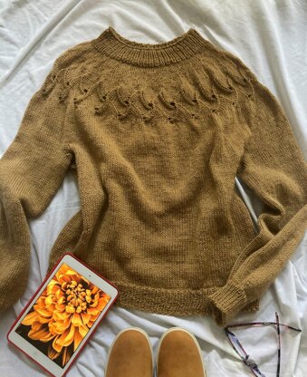 **GARMENT CONSTRUCTION:**The sweater is worked seamless from the bottom up. Sleeves are worked first then set aside. Body is worked from the hemline to underarm then sleeves are joined the garment is worked to the top. A pretty pattern is added to the yoke. The length of the garment can be easily adjusted to suit.