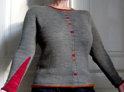 A bold triangle insert is knitted into the right sleeve as a finishing (yarn-saving) flourish. Not a seam in sight.