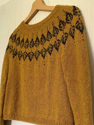 Starting at the neckline, this sweater is worked seamlessly from the top down. Short rows are added to shape the neckline and the stranded yoke is worked. The sleeves and body are separated and worked in the round.