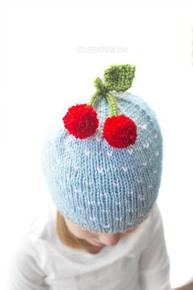This adorable polka dot hat sweet cherry hat knitting pattern has a subtle white dot pattern and two adorable cute pom pom cherries on top! The pattern includes instructions and step by step photos to knit this fun cherry hat in any of four sizes from baby to toddler including how to knit the split cherry stem (which is much easier than it sounds!) This is a fun knit for your baby or toddler!