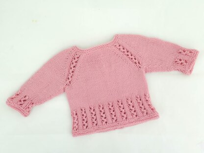 Sweet Lizzie is a Seamless Top Down Sweater/ Pullover pattern. This style of pullover is gaining popularity, and for good reason. Straightforward and fun to knit, looks great and doesn't require seaming of pieces. The pattern has raglan sleeve bands the feature a dainty lace panel, which is repeated at the hem of body and sleeves of the sweater. There is a button closure at back, but you could easily place it at front, if you prefer. A modern lace pullover for girls. Sizes: 0-3 months, 3-6 months, 6-12 months, 1-2 years, 3-4 years, 5-7 years Materials: 200- 200- 250- 250- 300- 350 g of DK yarn Amounts will vary, depending on your choice of yarn, if in doubt, get an extra ball. I used Rico Baby So Soft, but any DK yarn will work fine.