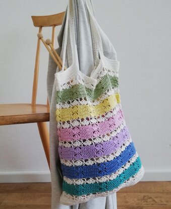 This charming bag design with lovely stripes in cheerful colors is perfect accessory for every day. You can take it to the market, the grocery or to the beach, but this bag is also big enough to carry on your knit or crochet projects.