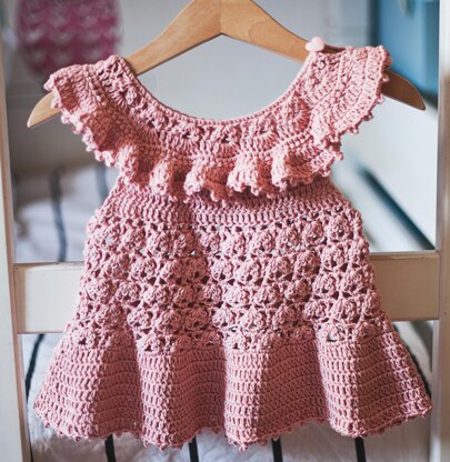 Sweet Pea Dress is worked top down. It is made with a sport weight yarn, but with quite loose stitching so that it drapes beautifully and is really soft and comfortable to wear. There is a button opening on one shoulder. The dress is made with cotton sport weight yarn, but you might use DK weight yarn as well, especially if using other fibre yarns, like bamboo or acrylic. However, the fabric should be light and flowy, not thick and stiff.