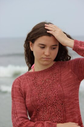 Sweet Poppy Pullover features elegant panels along the front and sleeves which include simple lace stitches and some smocking (wrapped stitches) which form the shape of poppies. If you’ve never done smocking before, you will be surprised at how easy this technique is and will want to use it all the time. The raglan shaping and top-down construction make this an easy sweater to customize according to your desired body length. Sleeves too, can be customized to ¾ length or long. Instructions are provided for both. The stitch patterns are provided in both written and charted formats.