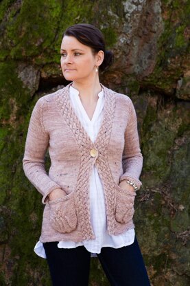 This lovely, romantic and feminine cardigan is seamlessly constructed from top-down with raglan sleeve shaping, featuring lovely pouch-like pocket details. The cable buttonband stitches are picked up from front pieces. Everything is worked seamlessly by knitting except the pocket linings are sewn down when finishing.