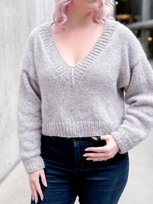 Knit top-down, this oversized drop-shoulder sweater is lightweight and airy. With 10-12” (25-30cm) of positive ease, a wide mitred v-neck collar, and a cropped length.