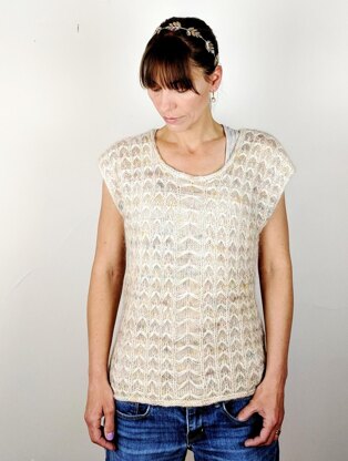 This shell tank uses a variation on a smock stitch to create a luxurious and elegant fabric. It’s not hard to do, but it does require working with two yarns at once, so experience with stranded knitting is an asset.