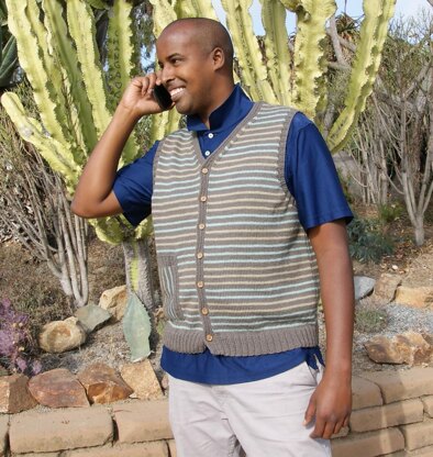 Swellegance is a man’s vest that shows style. It is both casual and elegant, depending on the mood of the man wearing it and the clothes it is paired with. This vest is knitted repeating a set of 5 stripes, which alternate between 2 complementing colors. The stripes design makes it modern, the Peruvian wool makes it warm, and the over-sized pocket with button closure makes it practical. The body, knit entirely in stockinette stitch, is framed on the bottom and around the arm opening by a regular knit 2 purl 2 ribbon. The button band and V-neck opening is knit in alternating garter and stockinette row pairs to counteract the stripes. This pattern is easy even for the beginning knitter. The model is wearing the XL size vest.