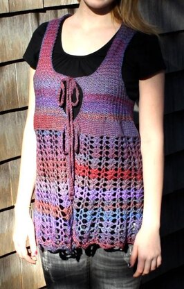 The swing, swing, swingy shape of this a-line vest with tie-front closures gives a sleek, flattering finish to any outfit. Take advantage of the wide variety of fabulous sock yarns out there to create something unique for your wardrobe. The stretchy stitch used in the bodice makes this vest comfortable as well as flattering, and since the a-line shape is achieved by increasing hook sizes as you stitch, this is a very quick project to whip up.